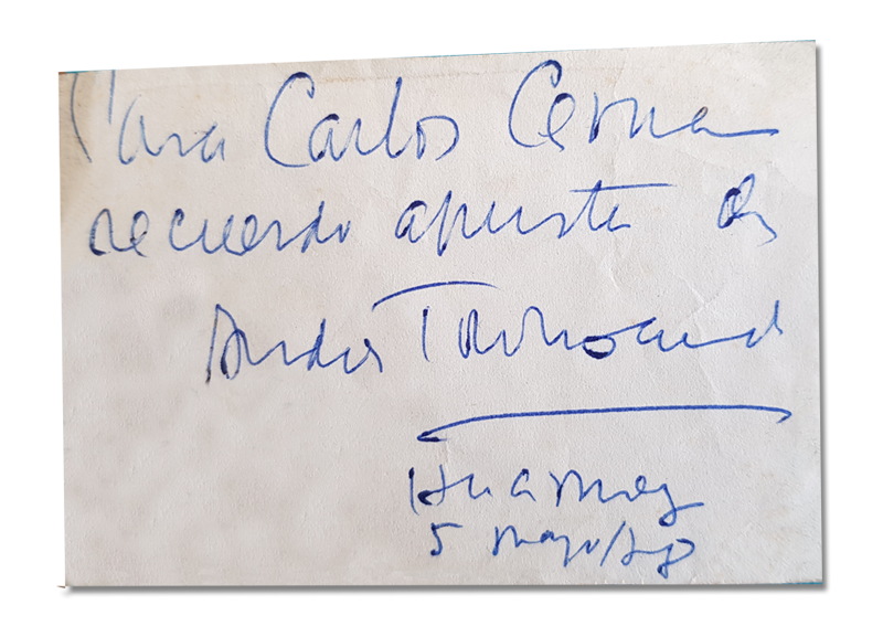Autógrafo de Andrés Towsend en el almuerzo ofrecido en nuestro hogar a su comitiva y dirigentes locales del partido tras mitín en Huarmey, 1978.